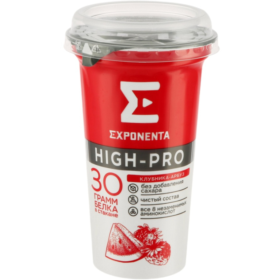 Напиток кисломолочный EXPONENTA High-pro Клубника, арбуз обезжиренный с высоким содержанием белка, без змж – обезжиренный кисломолочный напиток с высоким содержанием белка, который помогает эффективно восполнить норму этого компонента, быстро насыщает и надолго избавляет от чувства голода. Яркий насыщенный вкус ароматной клубники и сочного арбуза. Рекомендуется всем, кто заботится о своем здоровье.