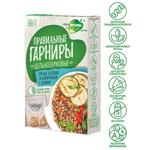 Гречка зеленая и коричневая с цукини – больше пользы в привычном вкусе. Продукт для тех, кто хочет добавить в свой рацион больше пользы, не изменяя привычек питания. Готовый гарнир через 25 минут. В составе нет жгучих специй и соли, поэтому гарнир подойдет для взрослых и детей. Компоненты гарнира положительно влияют на различные процессы: