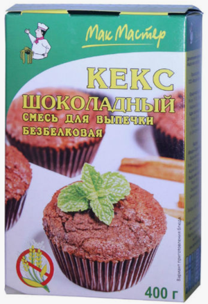 Это безбелковая смесь для выпечки **шоколадного кекса**, которая вырабатывается в отдельном производственном помещении из безбелкового сырья - кукурузного крахмала и **обогащена пищевыми (свекловичными) волокнами**.