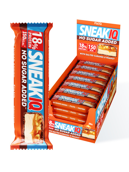 SNEAKIQ BAR — функциональный десерт нового поколения, созданный для максимального вкуса и пользы в одном батончике. Жареный арахис с солёной карамелью сверху и нежный протеиновый слой снизу.