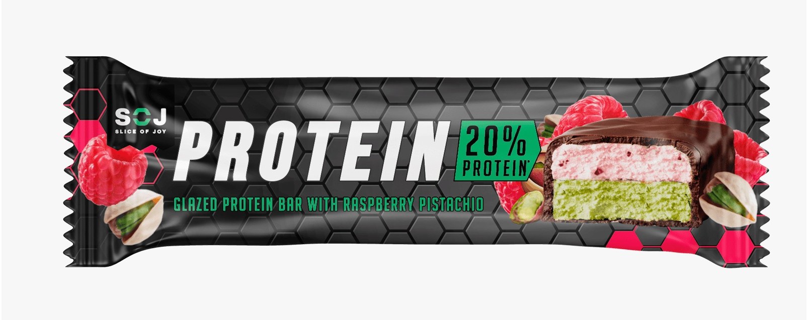Протеиновые батончики SOJ в молочном шоколаде с малиново-фисташковым вкусом — это сочетание пользы, насыщенного вкуса и оригинальной текстуры.