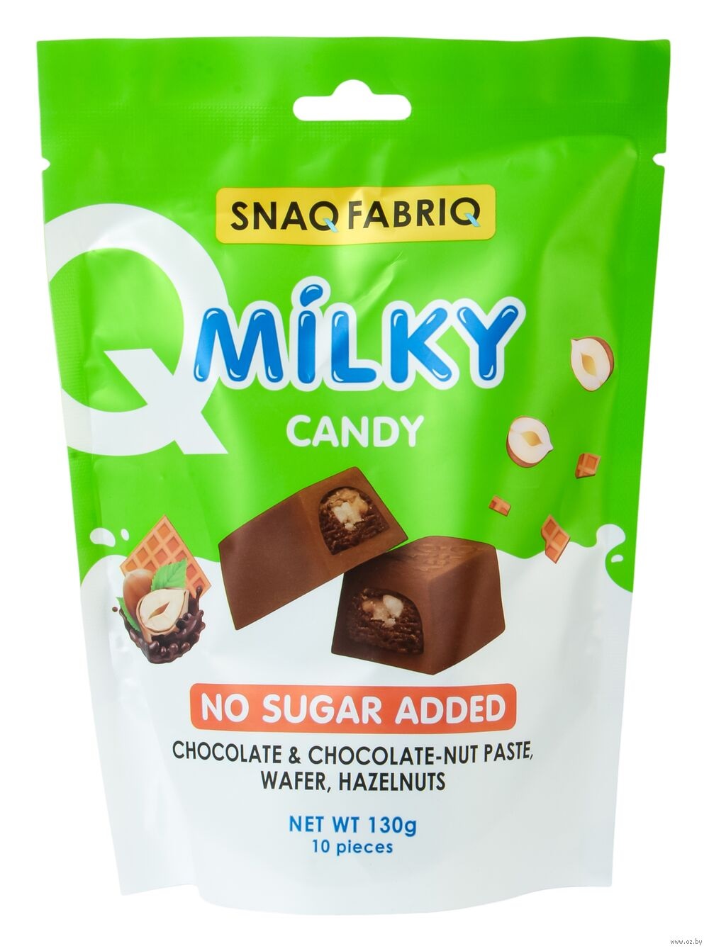 MILKY CANDY от SNAQ FABRIQ - 10 вкуснейших шоколадных конфет с начинкой из шоколадно-ореховой пасты, вафли и фундука. Максимум наслаждения без сахара и пальмового масла.