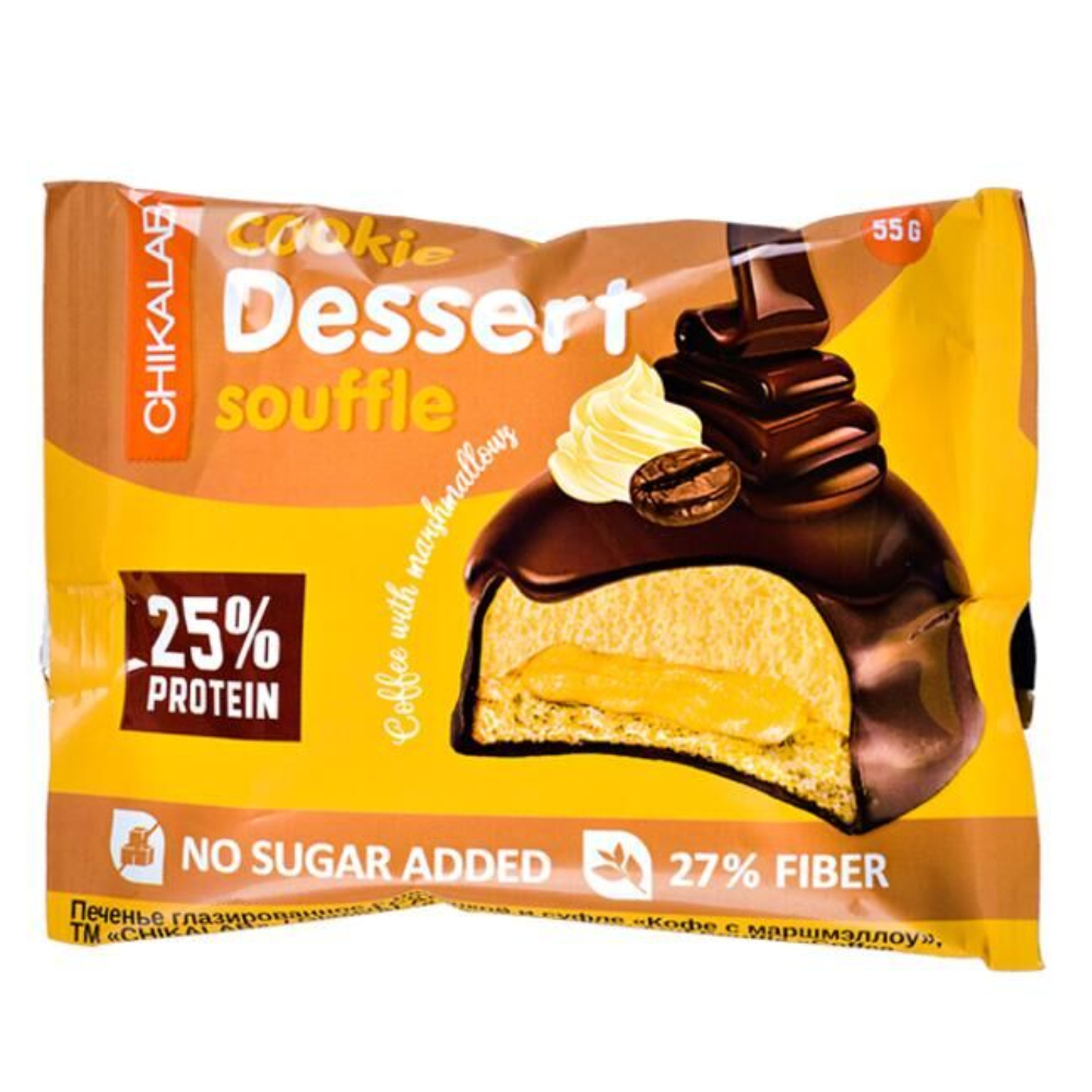Протеиновое печенье в шоколадной глазури с нежным суфле и изысканной начинкой Cookie Dessert Souffle от компании Chikalab отлично дополнит ваш рацион питания и станет прекрасным перекусом для тех, кто заботится о своей фигуре. Каждая порция содержит 14 грамм белка из сывороточного и молочного протеина. Низкое содержание углеводов в печенье позволит легко дополнить им любую диетическую программу питания.