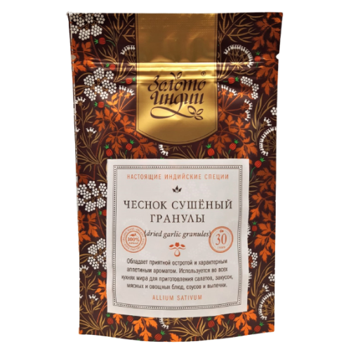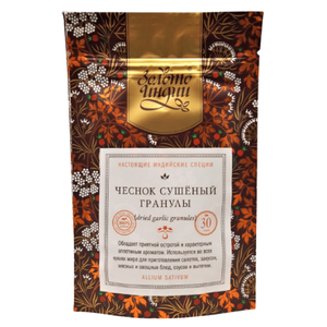 Чеснок сушеный гранулы (Dried Garlic Granules) Золото Индии - натуральная приправа. Обладает приятной остротой и характерным аппетитным ароматом. Используется во всех кухнях мира для приготовления салатов, овощных и мясных блюд, соусов, закусок и выпечки. Благодаря бережной сушке в естественных условиях, продукт полностью сохраняет оригинальные вкусовые и целебные свойства.