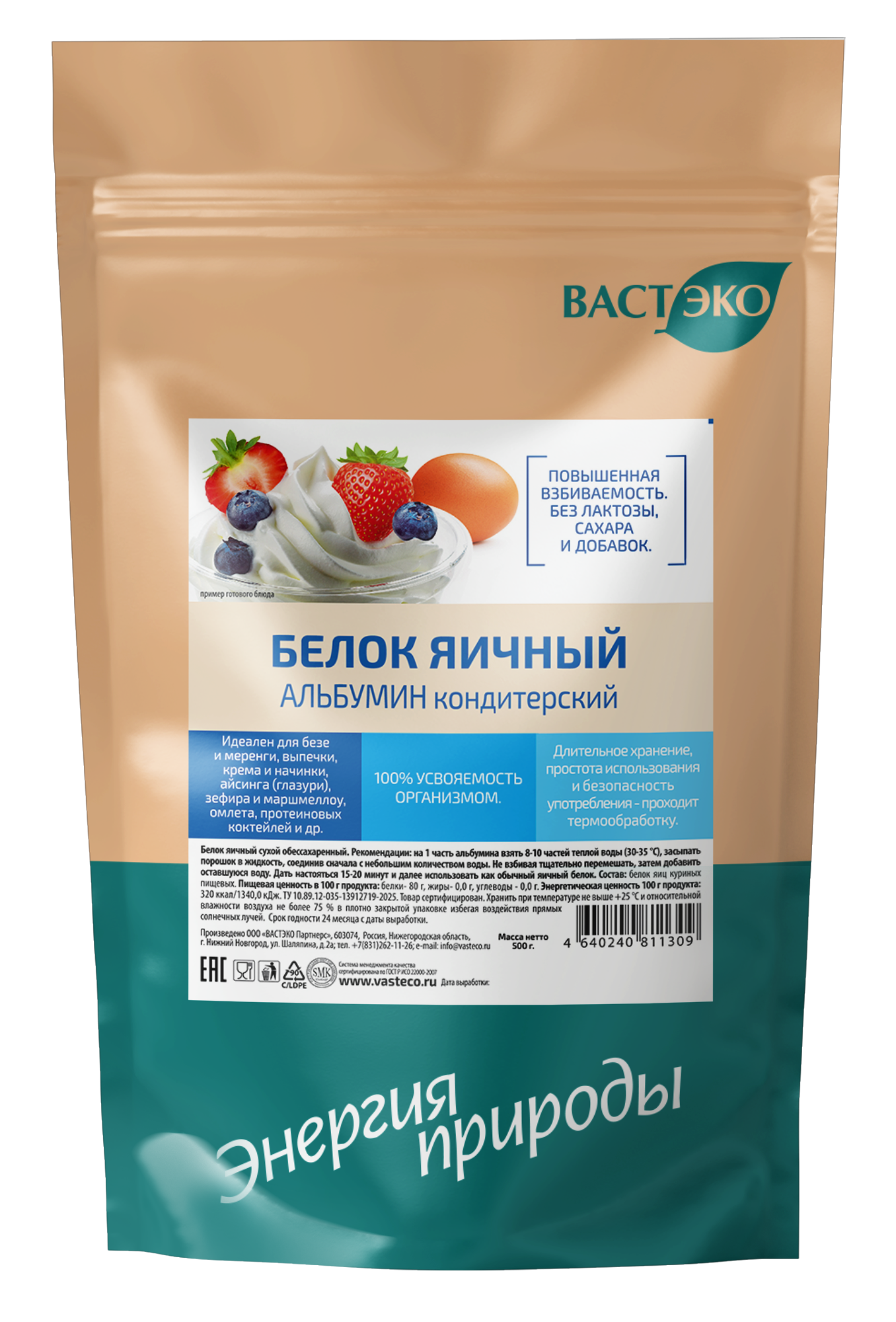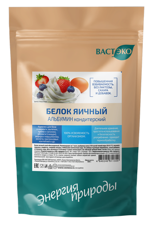 Яичный белок (Альбумин кондитерский) – используется вместо свежего яичного белка, для удобства и упрощения технологического процесса при приготовлении кондитерской продукции и спортивного питания. Прекрасный выбор для создания аппетитных и полезных десертов.