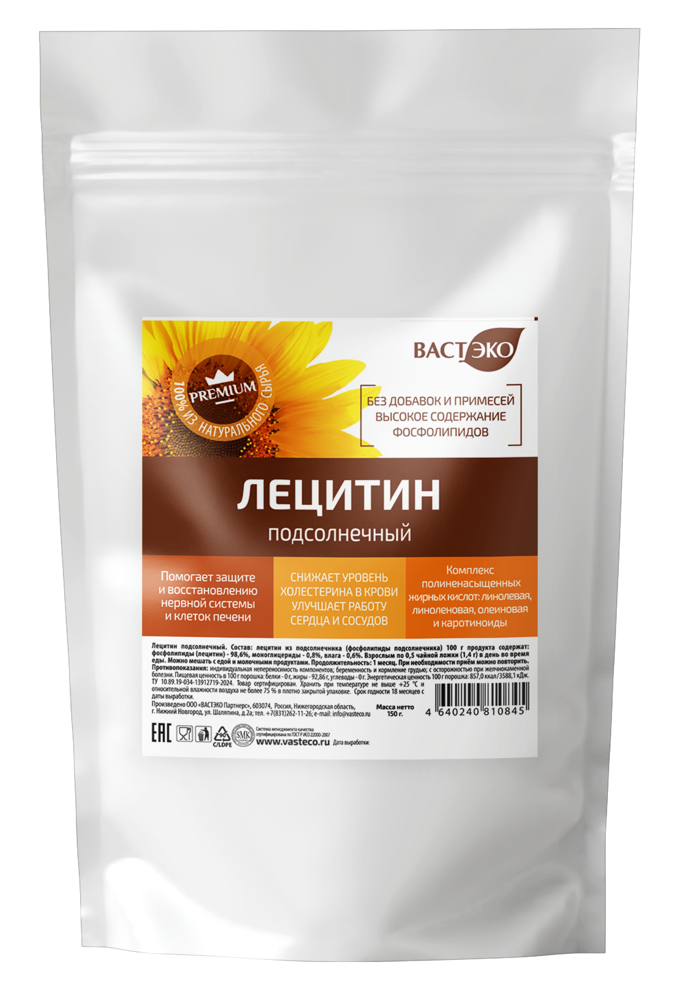 Лецитин Подсолнечника (sunflower lecithin) от Вастэко — 100% натуральный растительный комплекс из семян подсолнечника с повышенным содержанием фосфолипидов, холином, витамином E и активными жирными кислотами. Не содержит скрытых примесей, глютена, сои и искусственных добавок — наш продукт идеален для тех, кто ценит чистоту питания.